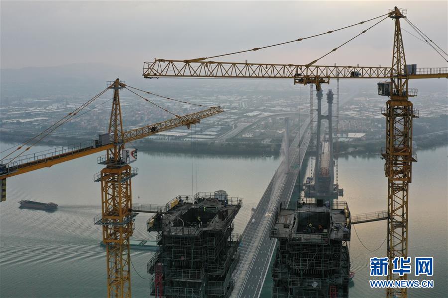 廣州南沙港鐵路跨西江斜拉橋主塔封頂