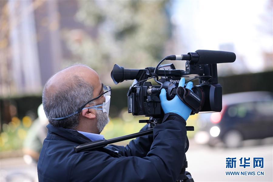 3月18日,在比利時(shí)布魯塞爾,一名佩戴口罩的記者在街頭采訪。 新華社記者 張鋮 攝