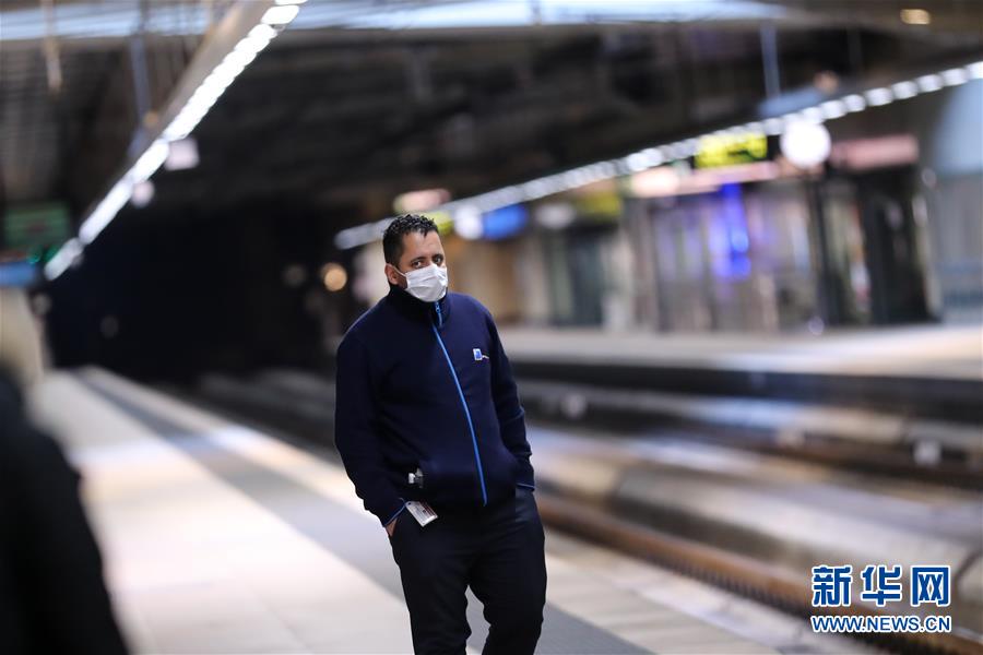 3月18日,在比利時(shí)布魯塞爾,一名佩戴口罩的男子在舒曼火車站等車。 新華社記者 張鋮 攝