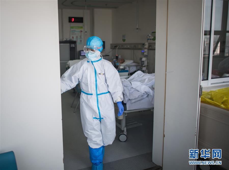 3月19日,在武漢市肺科醫(yī)院隔離病房,海南醫(yī)療隊隊員在現(xiàn)場忙碌。 新華社記者 肖藝九 攝