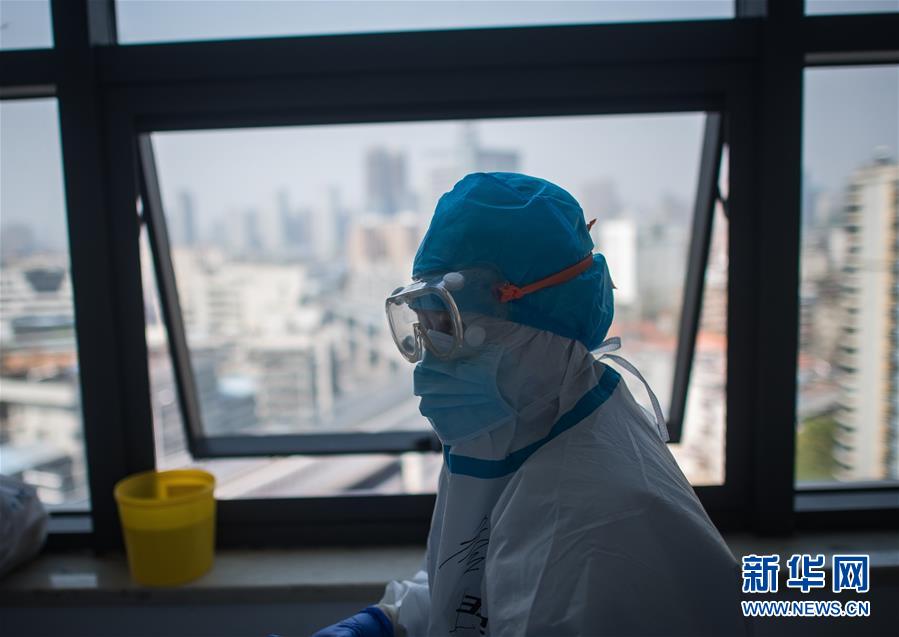 3月19日,在武漢市肺科醫(yī)院隔離病房,海南醫(yī)療隊(duì)隊(duì)員詹才露在現(xiàn)場忙碌。 新華社記者 肖藝九 攝
