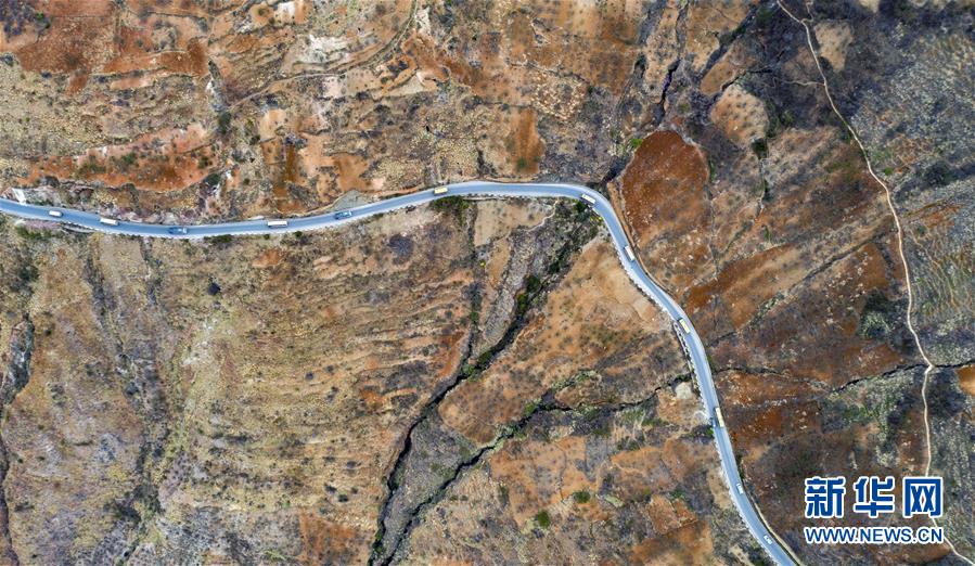 搬家的車隊在開道警車的引領(lǐng)下從云南省永善縣大興鎮(zhèn)開往魯?shù)榭h卯家灣易地扶貧安置區(qū)(3月15日攝,無人機(jī)照片)。 新華社記者 江文耀 攝