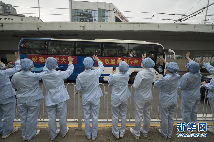 3月21日,武漢市第一醫(yī)院的醫(yī)護(hù)人員(前)送別天津市醫(yī)療隊隊員。新華社記者費(fèi)茂華攝
