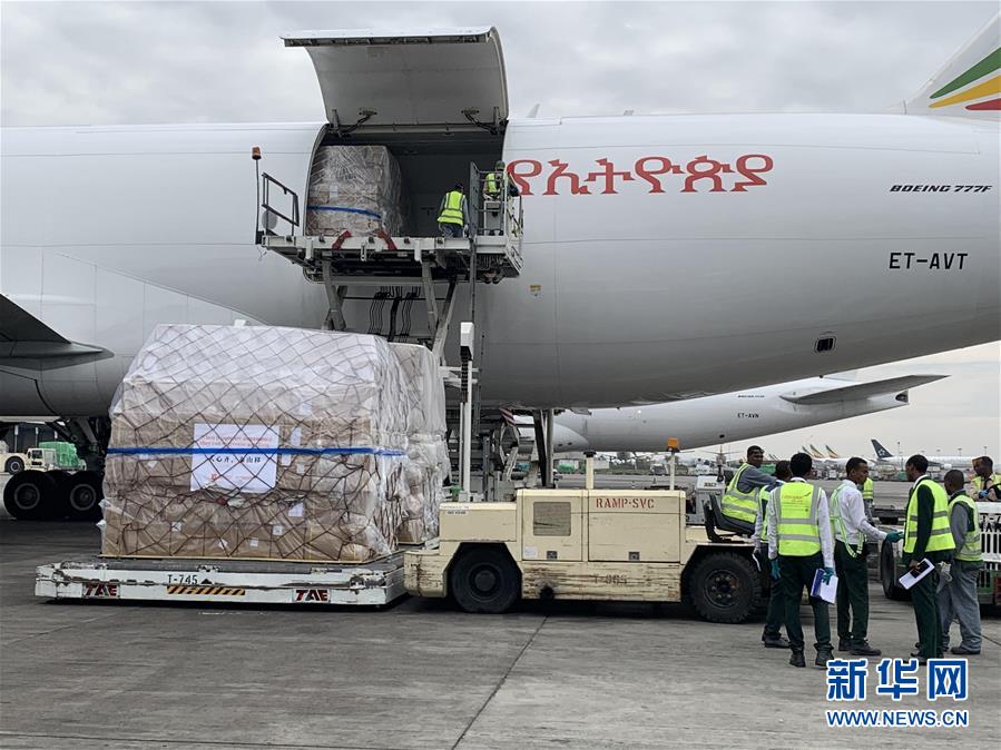 3月22日,在埃塞俄比亞首都亞的斯亞貝巴國際機場,工作人員將中國援助的抗疫物資運下飛機。歷時10小時飛行,滿載著來自中國抗疫物資的埃航貨運包機22日上午抵達埃塞俄比亞首都亞的斯亞貝巴的國際機場,這是馬云公益基金會和阿里巴巴公益基金會捐贈非洲的部分醫(yī)療物資,用于支援非洲54國抗擊疫情。新華社記者王守寶攝
