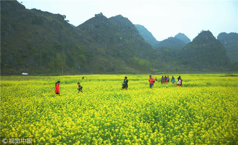 2019年2月5日,廣西來賓,當(dāng)天是農(nóng)歷大年初一,人們?cè)谛贸强h城關(guān)鎮(zhèn)隆光村油菜花海中賞花游玩。
