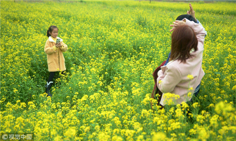 2019年2月5日,廣西來賓,當(dāng)天是農(nóng)歷大年初一,人們在忻城縣城關(guān)鎮(zhèn)隆光村油菜花海中賞花游玩。