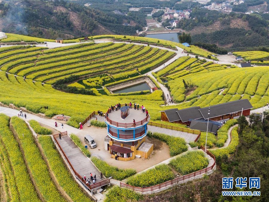 3月25日,游客在新登鎮(zhèn)上旺村黑山頂觀景臺(tái)觀賞油菜花海(無人機(jī)照片)。新華社記者徐昱攝