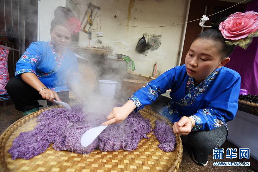 4月17日,在貴州省臺(tái)江縣姊妹街哆蝶五彩姊妹飯?bào)w驗(yàn)店,苗家婦女在攤晾五彩“姊妹飯”。新華社記者楊文斌攝