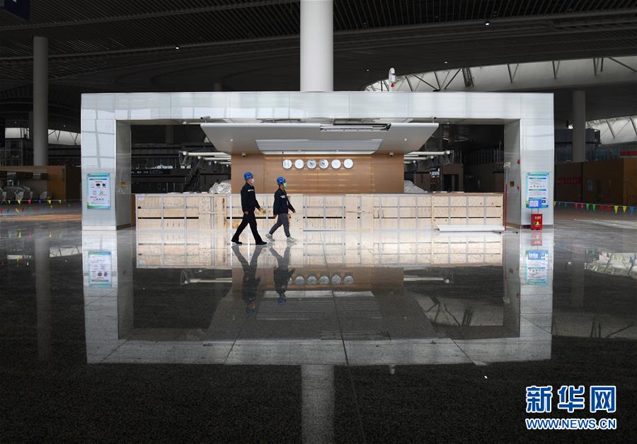 3月25日,兩名工程技術(shù)人員從建設(shè)中的青島膠東國(guó)際機(jī)場(chǎng)航站樓出發(fā)大廳走過(guò)。新華社記者李紫恒攝
