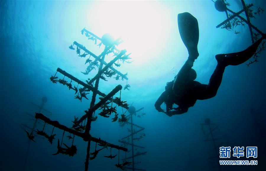 3月28日,在位于海南三亞蜈支洲島旅游區(qū)的海洋牧場,工作人員在進(jìn)行巡護(hù)。近日,位于海南三亞蜈支洲島旅游區(qū)的海洋牧場復(fù)工,海底作業(yè)逐漸恢復(fù)正常,開始進(jìn)行人工魚礁吊裝擺位、水下監(jiān)控清理以及日常巡護(hù)等工作。據(jù)介紹,人工魚礁有利于魚類種類增加和數(shù)量提高,蜈支洲島海域海洋牧場人工魚礁表面附著珊瑚、貝類、藻類等生物種類達(dá)120余種。新華社記者楊冠宇攝