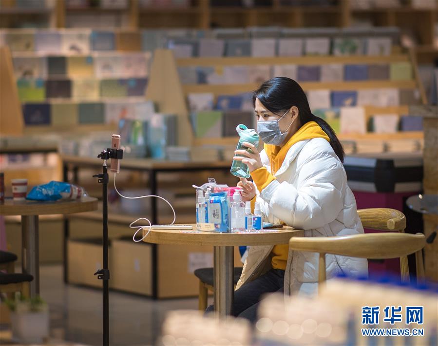 3月29日,在漢口北市場,一名主播在直播平臺(tái)直播銷售床上用品。新華社記者肖藝九攝