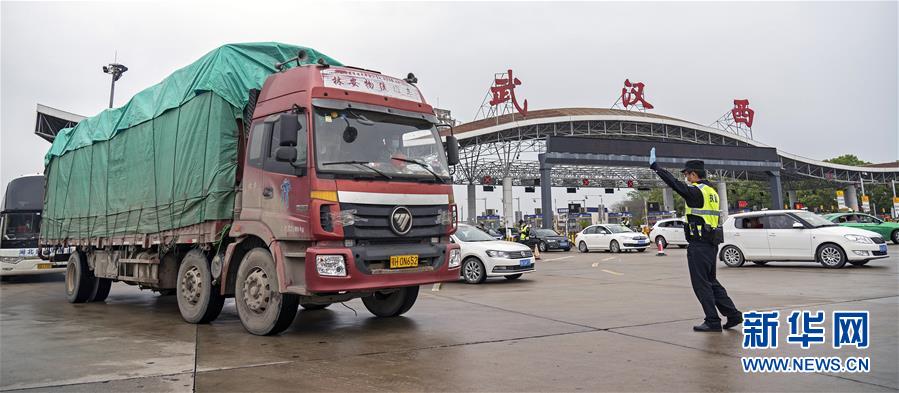 3月24日,在武漢西高速收費站交通卡點,執(zhí)勤民警準(zhǔn)備檢查車輛。新華社記者才揚攝