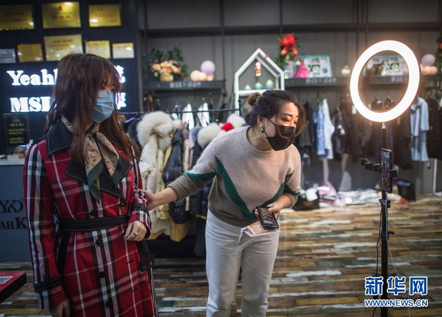 3月29日,在漢口北市場,主播在直播平臺直播銷售一款服裝。新華社記者肖藝九攝