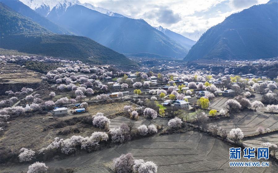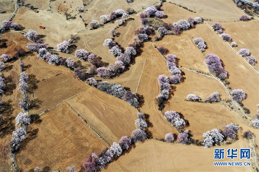 西藏林芝市波密縣境內(nèi)桃花盛開(kāi)的田園風(fēng)光(無(wú)人機(jī)照片,3月26日攝)。新華社記者 普布扎西 攝