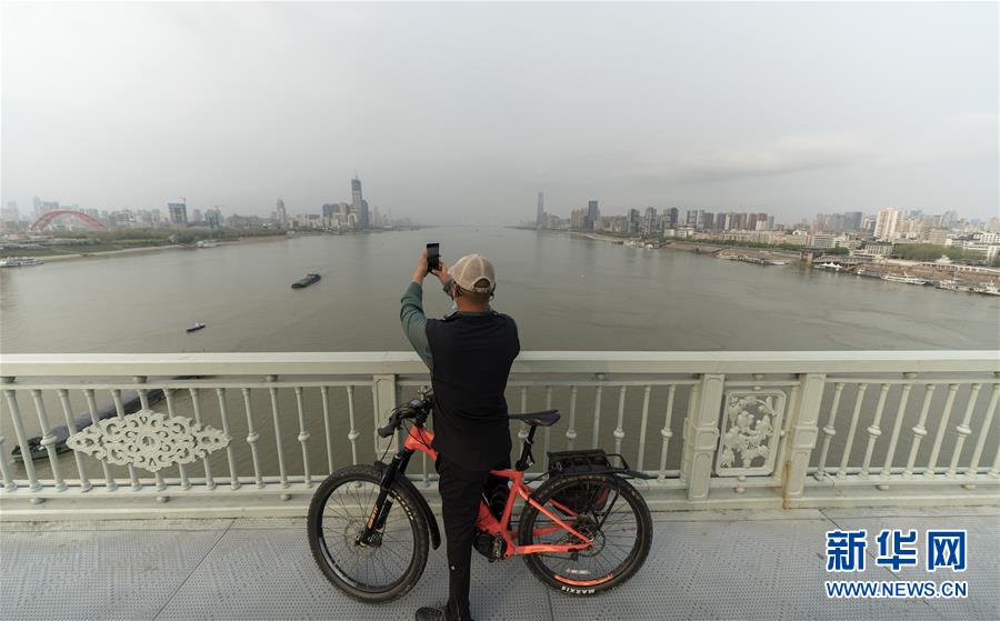 3月25日,在武漢長(zhǎng)江大橋,一名騎行的市民停下來(lái)拍照。新華社記者費(fèi)茂華攝