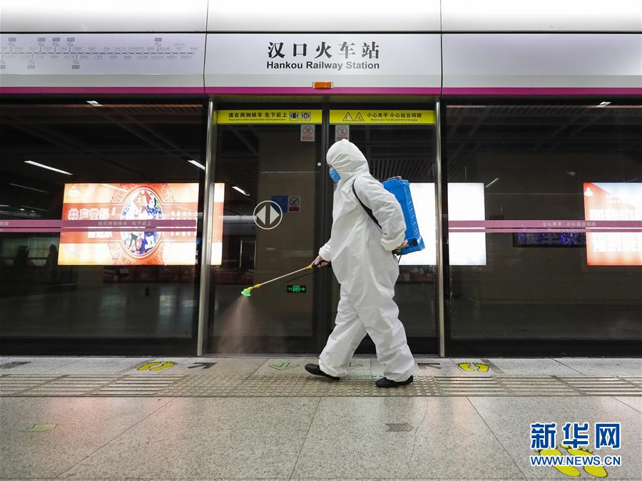 3月23日,在漢口火車(chē)站地鐵站,保潔人員在為站廳乘客通道消毒。目前,武漢城市功能和市民生活正逐步有序恢復(fù),地鐵、公交車(chē)系統(tǒng)已啟動(dòng)全面消殺和張貼乘客健康二維碼識(shí)別等舉措,為恢復(fù)運(yùn)營(yíng)做準(zhǔn)備。新華社記者沈伯韓攝