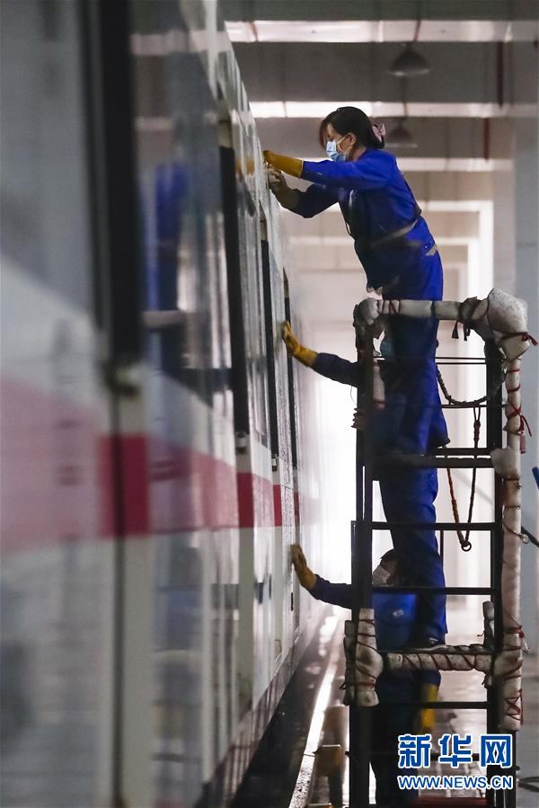 3月23日,在武漢地鐵常青車輛段,保潔人員清洗地鐵列車。新華社記者沈伯韓攝