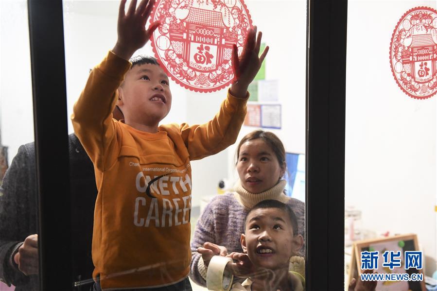 廣西興業(yè)縣搬遷群眾胡紅君(后右)的兒子在新居內貼窗花(2020年1月20日攝)。新華社記者曹祎銘攝