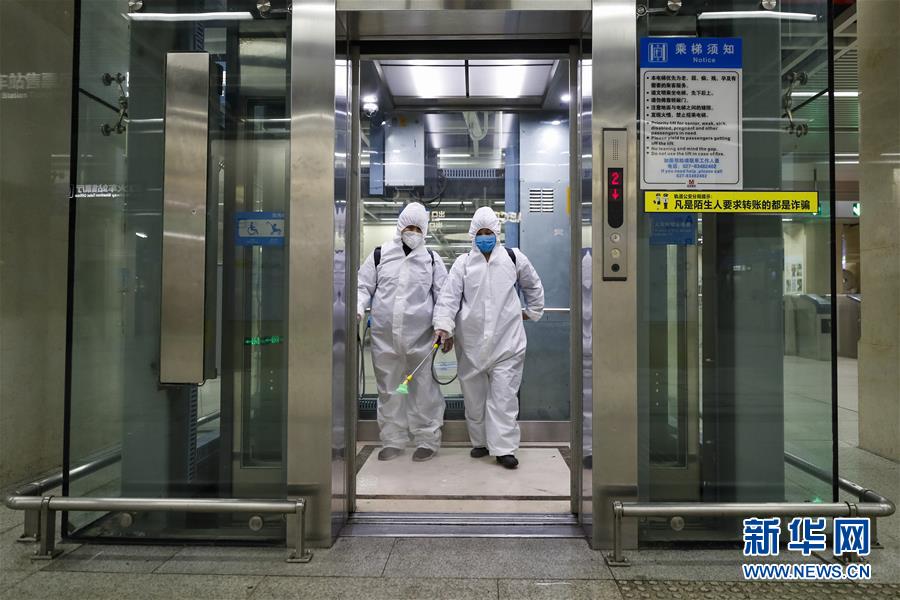 3月23日,在漢口火車站地鐵站,保潔人員在為站廳電梯消毒。新華社記者沈伯韓攝