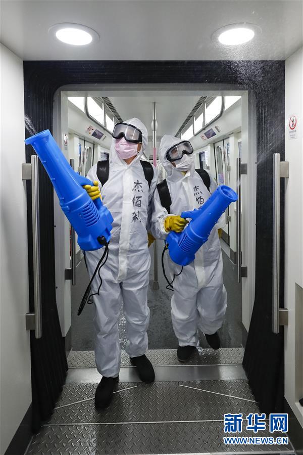 3月23日,在武漢地鐵常青車輛段,保潔人員為地鐵列車消毒。新華社記者沈伯韓攝