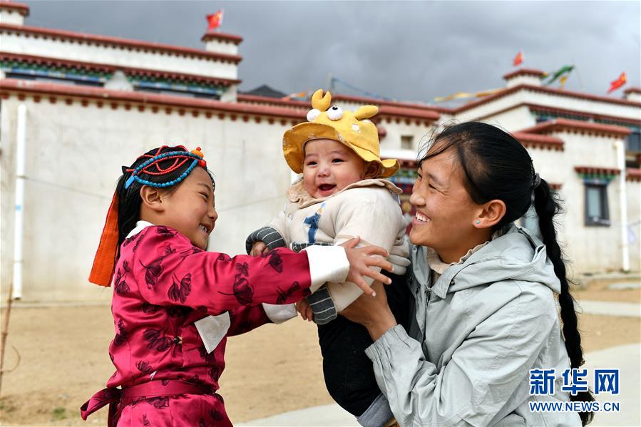 在拉薩市堆龍德慶區(qū)古榮鄉(xiāng)榮瑪高海拔生態(tài)搬遷點(diǎn),石珍(右)和女兒格桑曲達(dá)(左)、兒子嘎瑪曲英在家門口玩耍(4月1日攝)。石珍是榮瑪高海拔生態(tài)搬遷點(diǎn)醫(yī)務(wù)室的村醫(yī),這份工作每月為她帶來2590元收入。新華社記者 詹彥 攝
