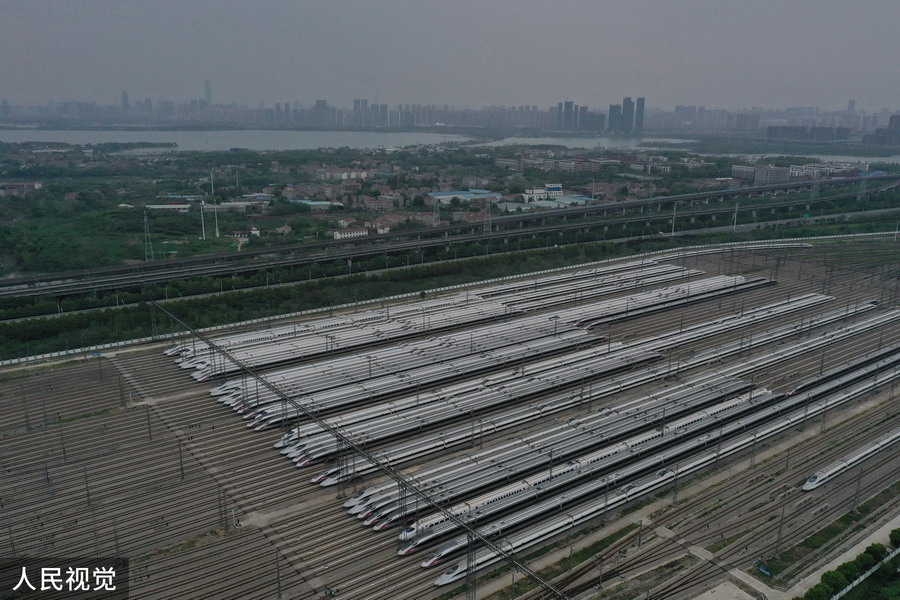2020年4月6日,武漢動車段高鐵動車組整裝待發(fā)(無人機照片)。