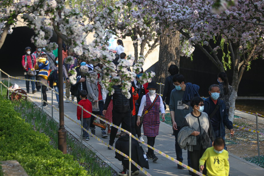 4月6日是清明小長假的最后一天,在元大都遺址公園內海棠花已全部盛開,形成片片海棠花溪,景色絕美。市民游客置身其中,感受春意盎然的氛圍。市民游客紛紛拍照留念,甚至不乏有身著漢服的小姐姐,在園內人流稀少處,迅速摘戴口罩拍下了美照,“C位出道“。