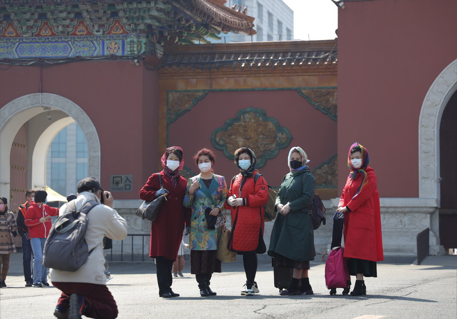 2020年4月6日,遼寧沈陽(yáng),北陵公園在清明小長(zhǎng)假的最后一天,游客猛增。市民對(duì)各項(xiàng)游戲都踴躍參與。圖為穿著美美長(zhǎng)裙的阿姨們?cè)诤嫌啊?/p>