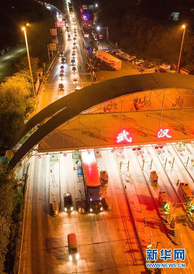 4月8日凌晨,車輛通過武漢北高速收費站(無人機照片)。 新華社記者 肖藝九 攝
