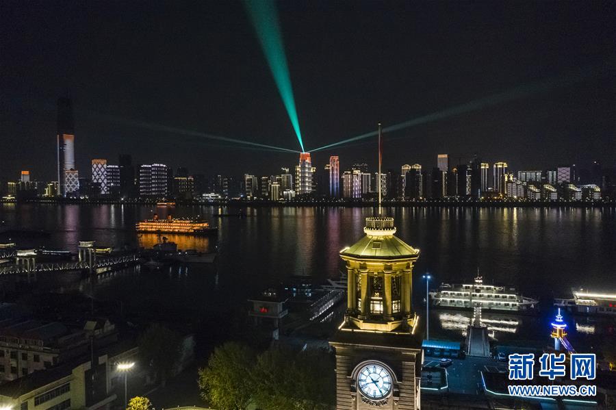 這是4月7日晚拍攝的武漢市江漢關(guān)博物館及長(zhǎng)江對(duì)岸建筑燈光夜景(無人機(jī)拍攝)。新華社記者沈伯韓攝