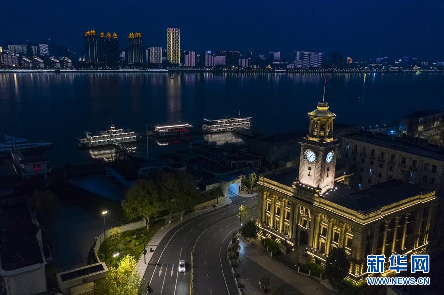 這是4月7日晚拍攝的武漢市江漢關(guān)博物館及長(zhǎng)江對(duì)岸建筑燈光夜景(無(wú)人機(jī)拍攝)。4月8日零時(shí)起,武漢市正式解除離漢離鄂通道管控措施。新華社記者沈伯韓攝