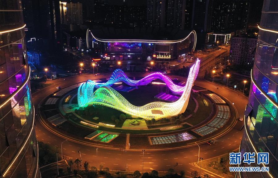 4月7日,武漢光谷環(huán)島開啟燈光秀(無人機(jī)照片)。當(dāng)日,隨著武漢解除離漢通道管控進(jìn)入倒計時,全市開啟了城市景觀照明,夜色中的武漢美不勝收。新華社記者李賀攝