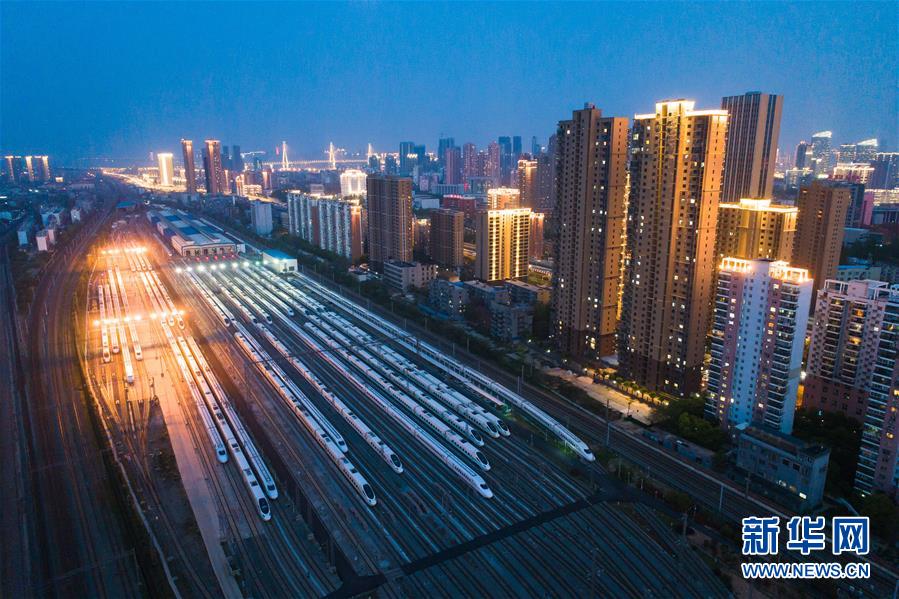 4月7日,在武漢動(dòng)車段,列車??吭诖孳嚲€上(無人機(jī)照片)。 新華社記者 肖藝九 攝