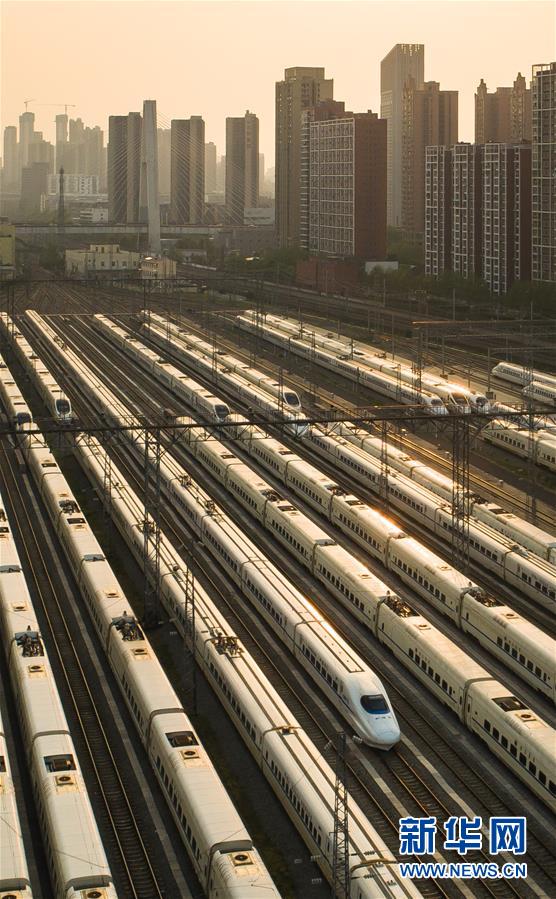 4月7日,在武漢動車段,列車??吭诖孳嚲€上(無人機照片)。 新華社記者 肖藝九 攝