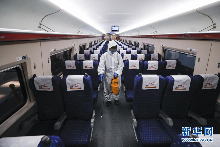 4月7日,武漢動車段運用車間工作人員周明輝在給列車消毒。新華社記者 沈伯韓 攝
