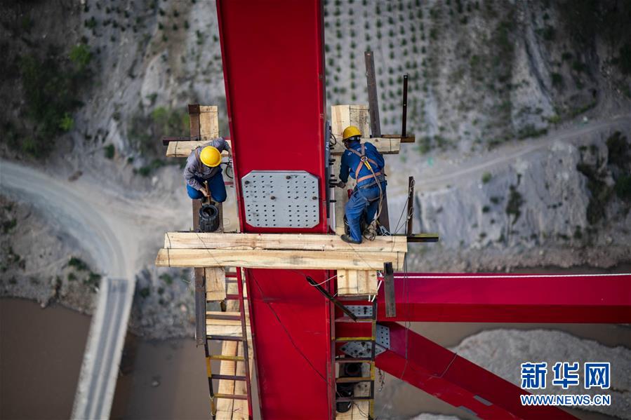 4月8日,兩名中鐵四局職工安裝架設(shè)鋼桁梁,每節(jié)鋼桁梁間的精度需要達到毫米級才能保證安裝到位。新華社記者江文耀攝