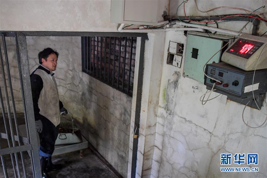 4月14日,中國(guó)大熊貓保護(hù)研究中心核桃坪基地飼養(yǎng)員周季秋在打掃完大熊貓“喜妹”的圈舍后,將大熊貓前一晚排泄的糞便稱重并記錄。新華社記者張超群攝