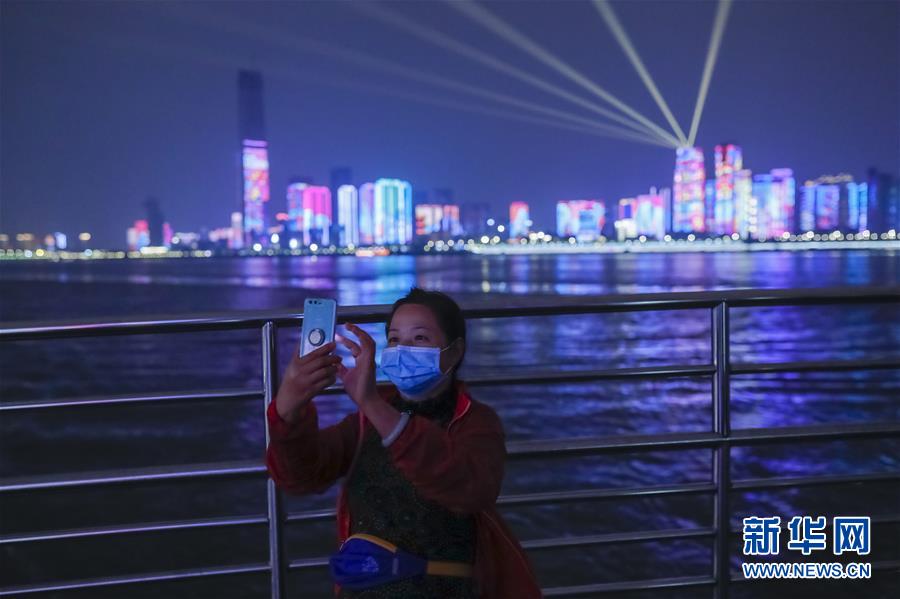 4月22日,市民乘坐武漢長江客運(yùn)輪渡出行時(shí),在船上拍攝夜景。為建立與經(jīng)濟(jì)社會發(fā)展和疫情防控需要相適應(yīng)的運(yùn)輸服務(wù)保障機(jī)制,保障市民出行需求,從4月22日起,武漢城市公共交通有序恢復(fù)全線網(wǎng)運(yùn)營。新華社記者沈伯韓攝