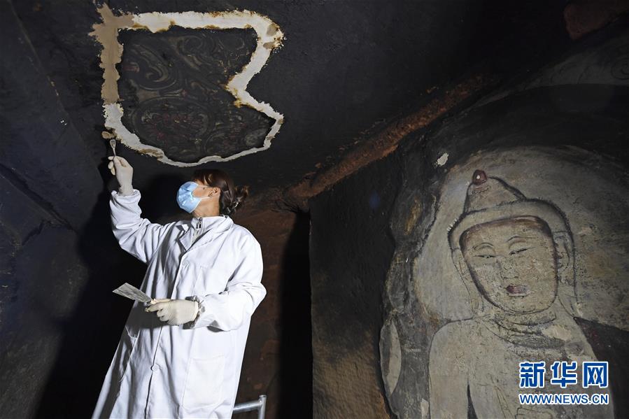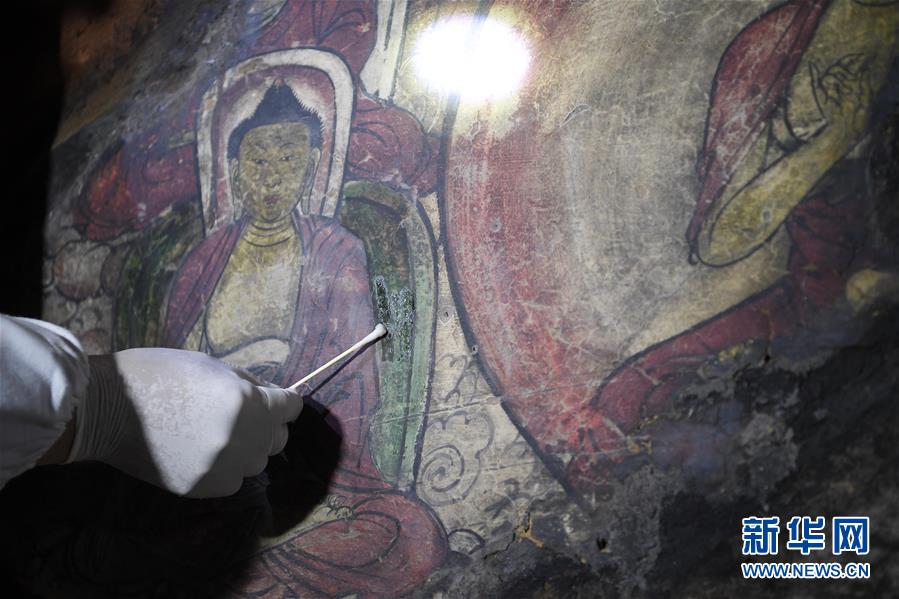 4月27日,文物修復(fù)專(zhuān)家在寧夏須彌山石窟圓光寺48號(hào)窟內(nèi)修復(fù)壁畫(huà)。新華社記者王鵬攝