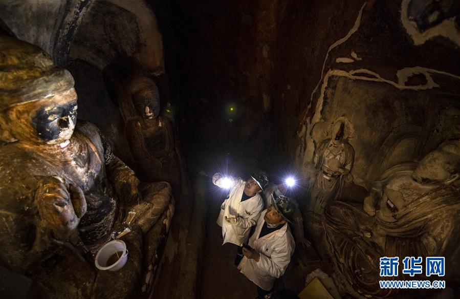 4月27日,文物修復(fù)專(zhuān)家在寧夏須彌山石窟圓光寺48號(hào)窟內(nèi)商量修復(fù)方案。新華社記者馮開(kāi)華攝