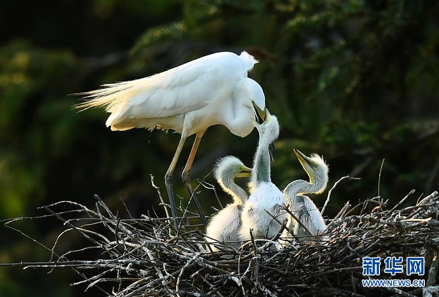 在南昌市新建區(qū)象山森林公園內,一只白鷺在鳥巢內給幼鳥喂食(4月27日攝)。近日,在江西省南昌市新建區(qū)象山森林公園內,已安家筑巢的大批白鷺進入繁殖旺季。在夕陽的照耀下,白鷺時而翩翩起舞,時而展翅盤旋,構成一幅美麗的自然生態(tài)畫卷。新華社記者萬象攝