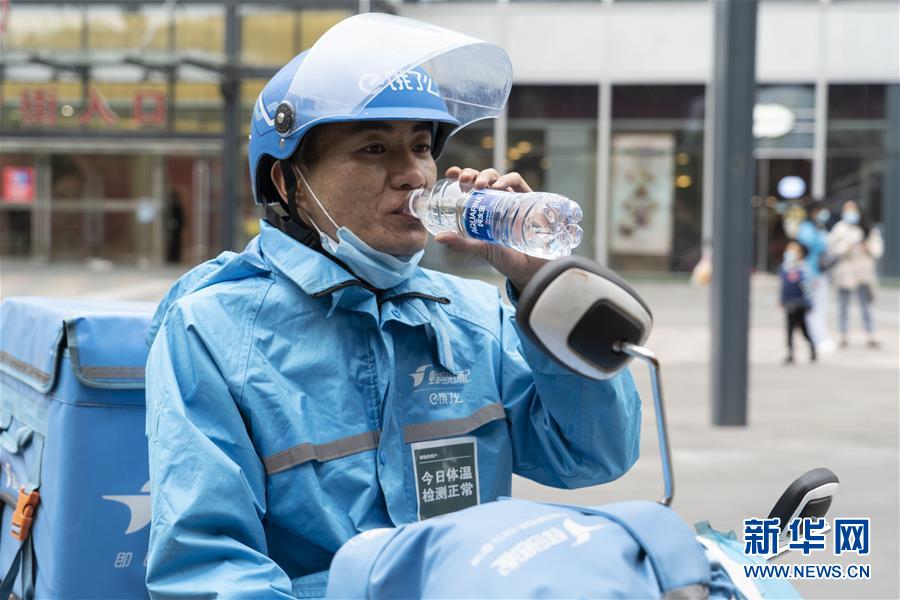 4月22日,在四川省成都市一家商場(chǎng)門前,邱有哈子在送餐間隙喝水休息。新華社記者 李夢(mèng)馨 攝