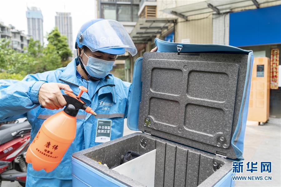 4月22日,在四川省成都市的一家外賣(mài)配送站點(diǎn),邱有哈子在給餐箱消毒。新華社記者 李夢(mèng)馨 攝