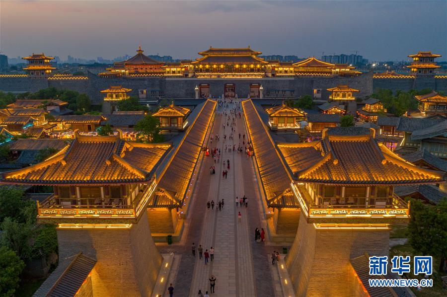 5月1日,游客在湖北省襄陽(yáng)市唐城景區(qū)觀賞夜景(無(wú)人機(jī)照片)?!拔逡弧奔偃掌陂g,人們以多種方式放松心情、享受假日。新華社發(fā)(楊東攝)