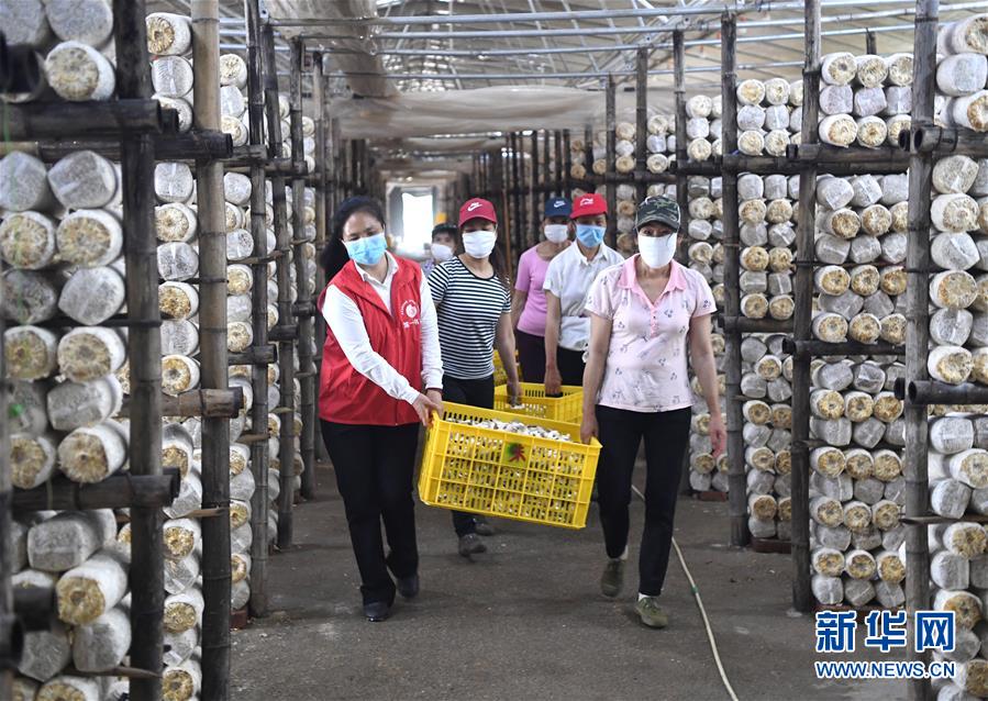 唐莉(左一)在平樂(lè)縣張家鎮(zhèn)食用菌生產(chǎn)基地幫工人搬運(yùn)袖珍菇(5月4日攝)。新華社記者周華攝
