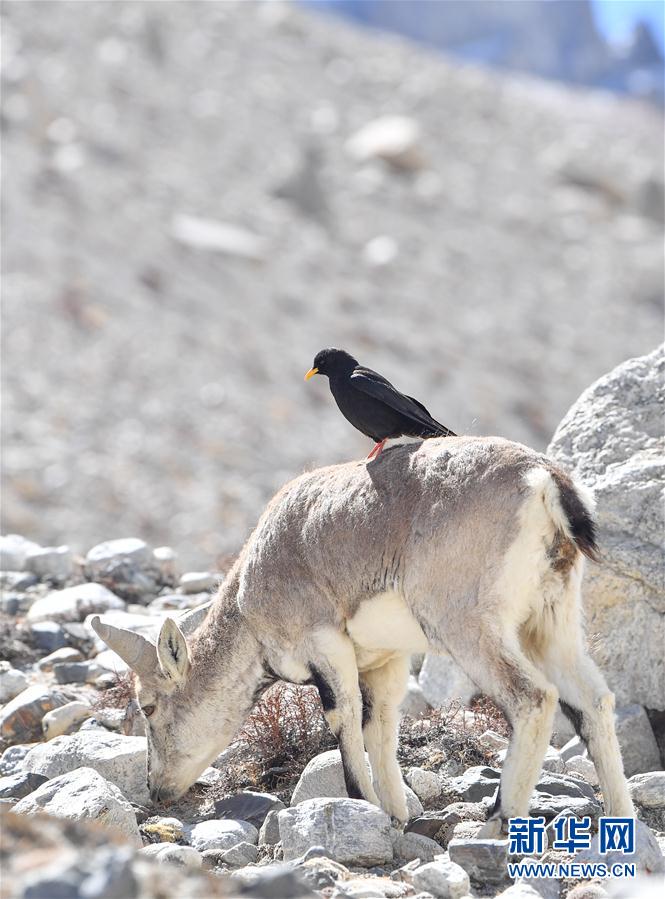 黃嘴山鴉停在巖羊背上(5月8日攝)。當(dāng)日,一群巖羊在珠峰大本營(yíng)周圍覓食,黃嘴山鴉飛到巖羊身上停留,構(gòu)成一幅幅生動(dòng)有趣的雪域圖畫。新華社記者普布扎西攝