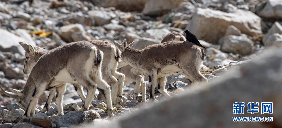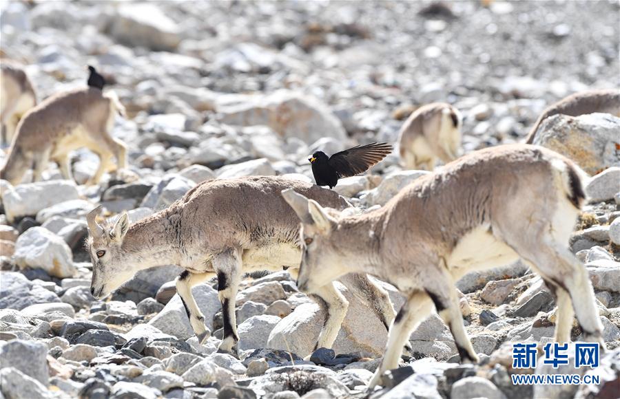 一只黃嘴山鴉停留在巖羊身上(5月8日攝)。當(dāng)日,一群巖羊在珠峰大本營(yíng)周圍覓食,黃嘴山鴉飛到巖羊身上停留,構(gòu)成一幅幅生動(dòng)有趣的雪域圖畫。新華社記者晉美多吉攝