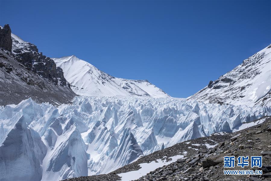 珠峰海拔5800米至海拔6500米的冰塔林(5月9日攝)。從海拔5800米的珠峰過渡營地到海拔6500米的前進(jìn)營地,冰塔林沿山谷排列,蔚為壯觀。新華社記者孫非攝