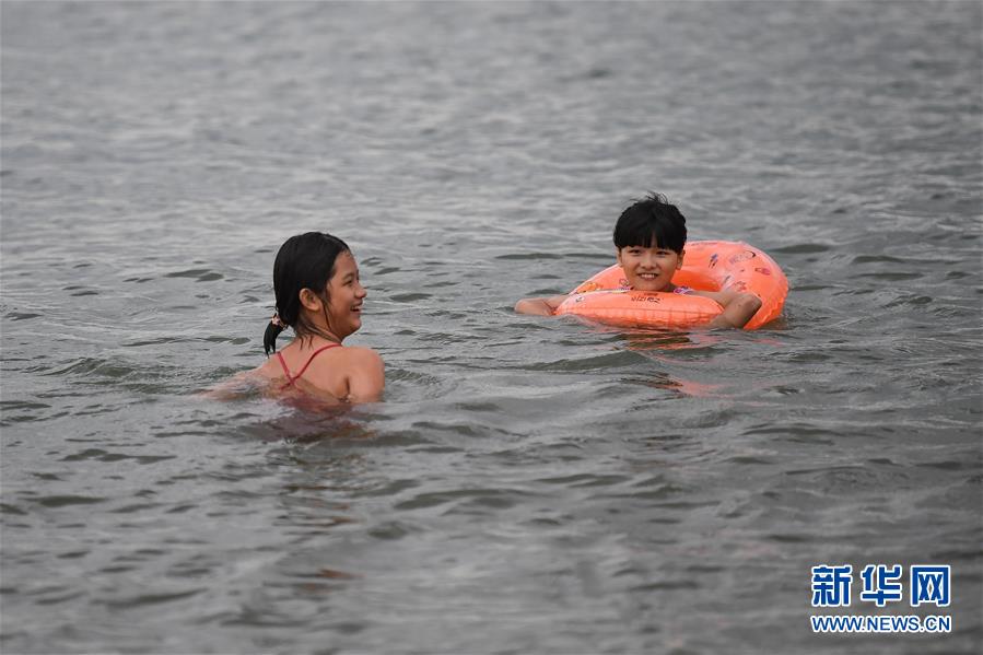 5月10日,市民在??谖餍愫┖S驊蛩=?,??诔掷m(xù)高溫,不少市民前往海灘戲水消暑。新華社記者蒲曉旭攝