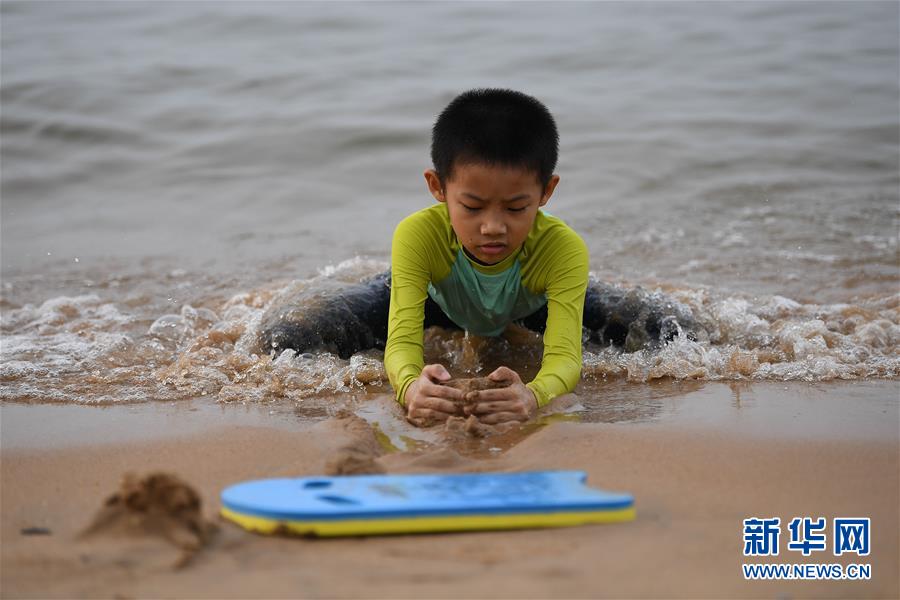5月10日,小朋友在??谖餍愫┩嫠!=?,??诔掷m(xù)高溫,不少市民前往海灘戲水消暑。新華社記者蒲曉旭攝